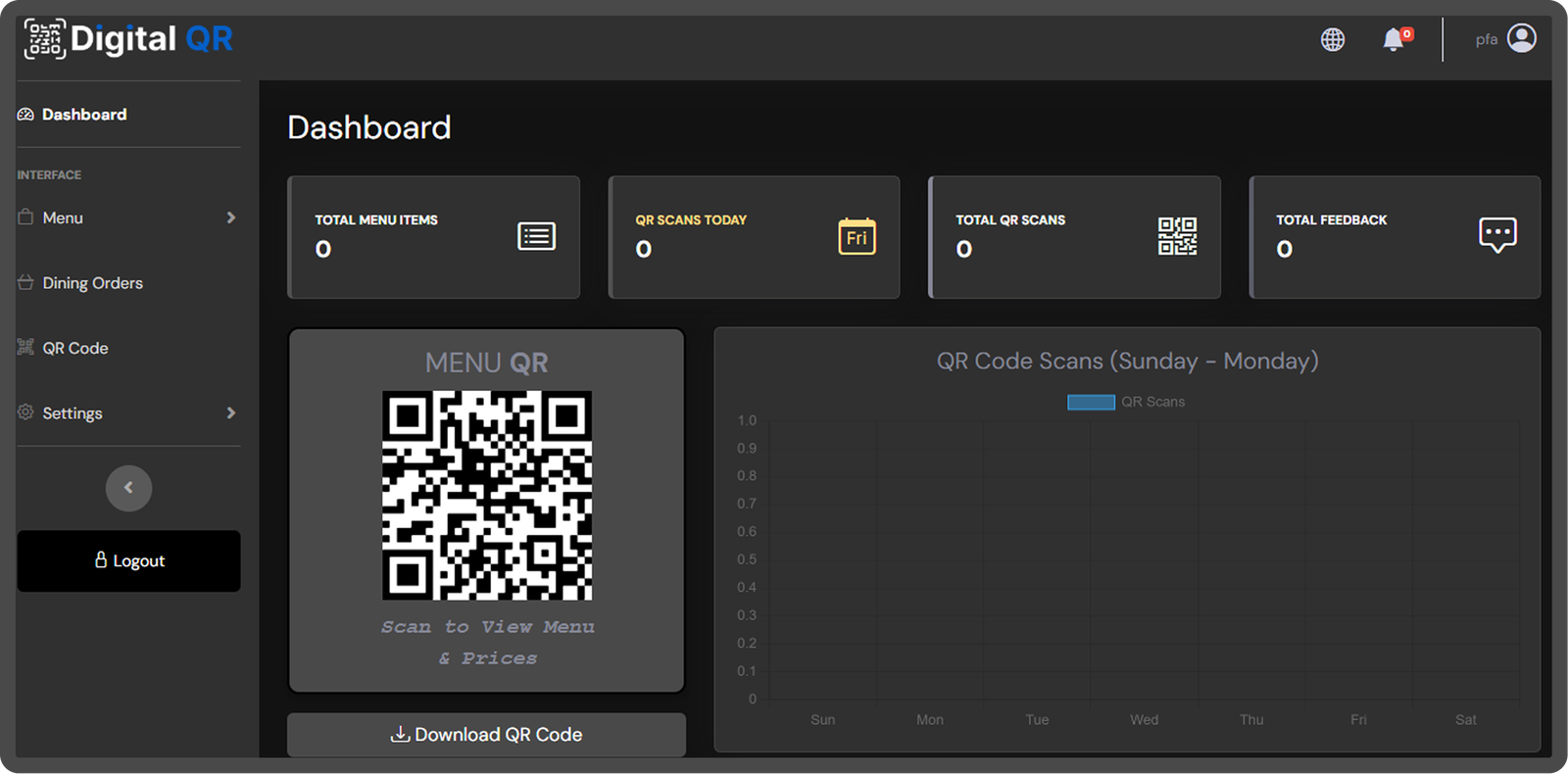 Our dashboard provides real-time insights into menu performance, including the total number of menu items, daily QR scans, overall QR activity, and customer feedback. With an intuitive interface, you can easily add, edit, or remove menu items, ensuring that your customers always see the latest updates without the need for physical reprints.